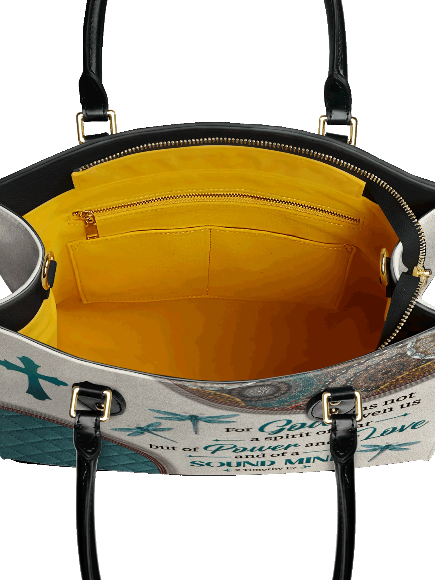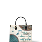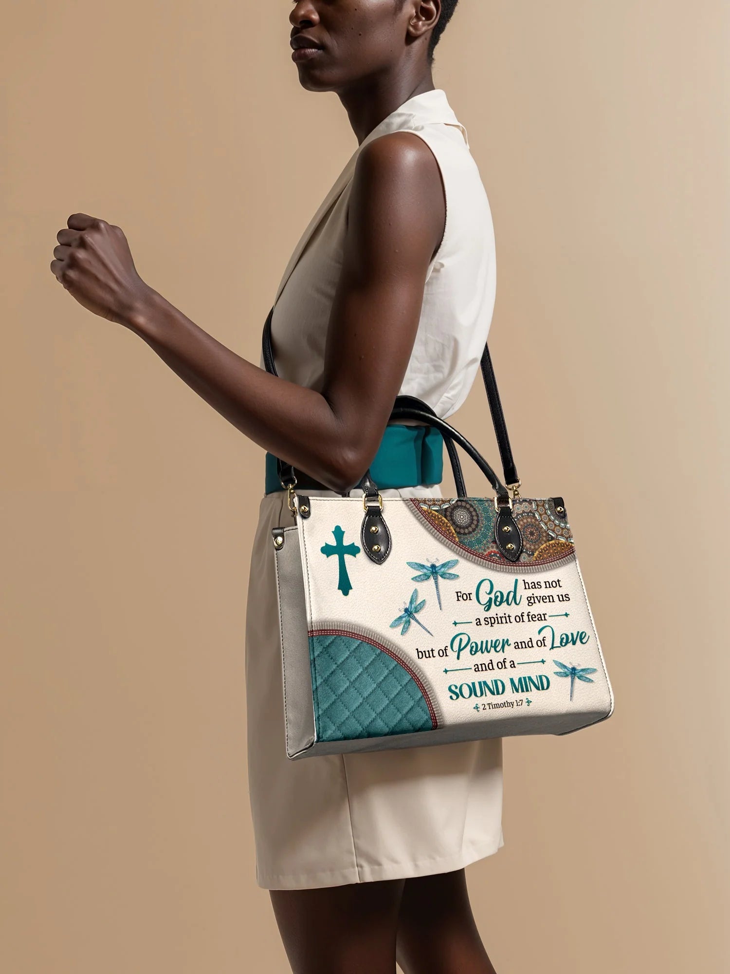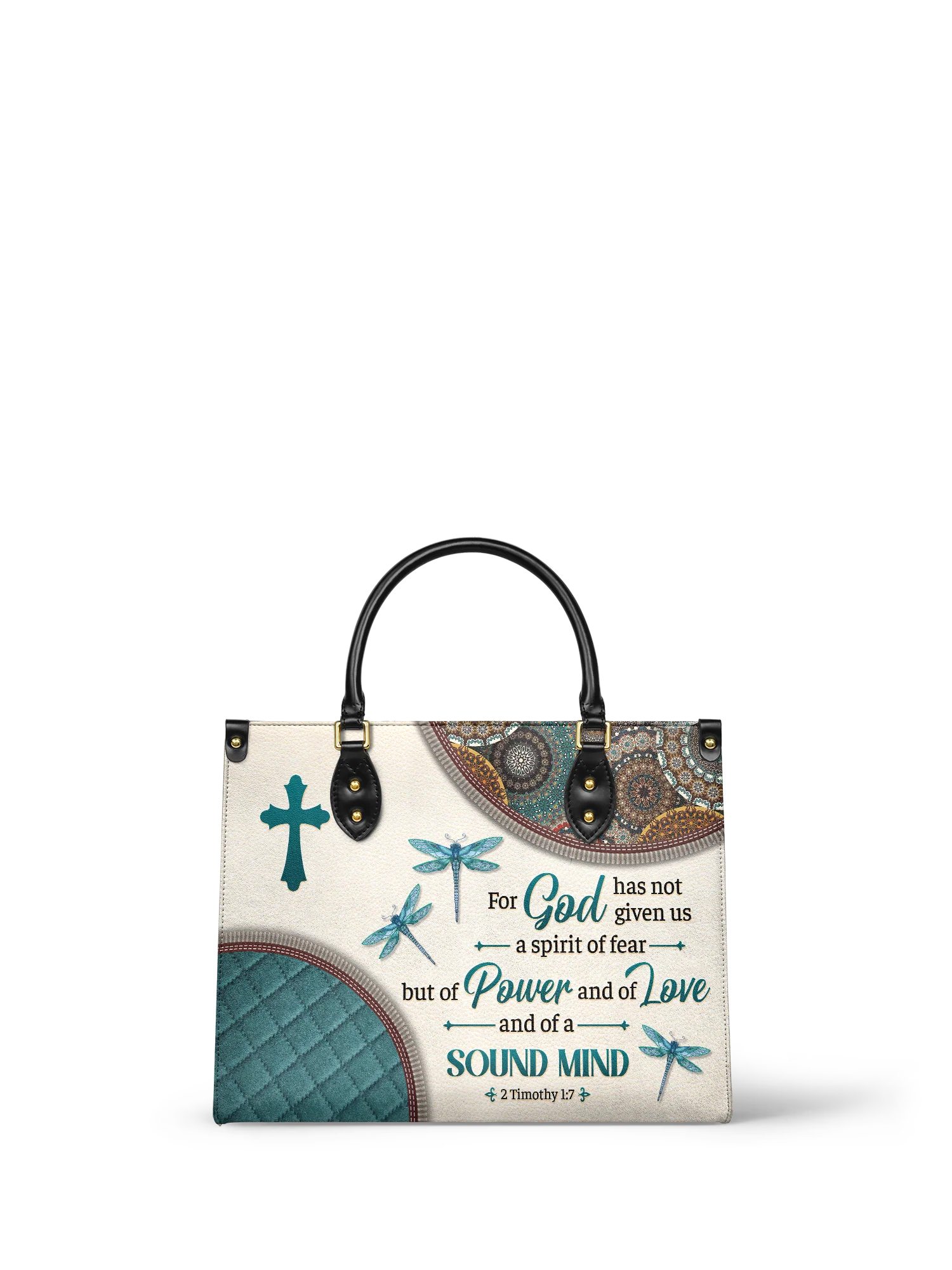 Featuring 2 Timothy 1:7, it reminds you that God has given you a spirit of power, love, and a sound mind. The graceful dragonflies symbolize transformation and faith, while intricate patterns add a touch of elegance. Designed for women who walk boldly in His truth, this handbag is a timeless statement of faith and confidence.