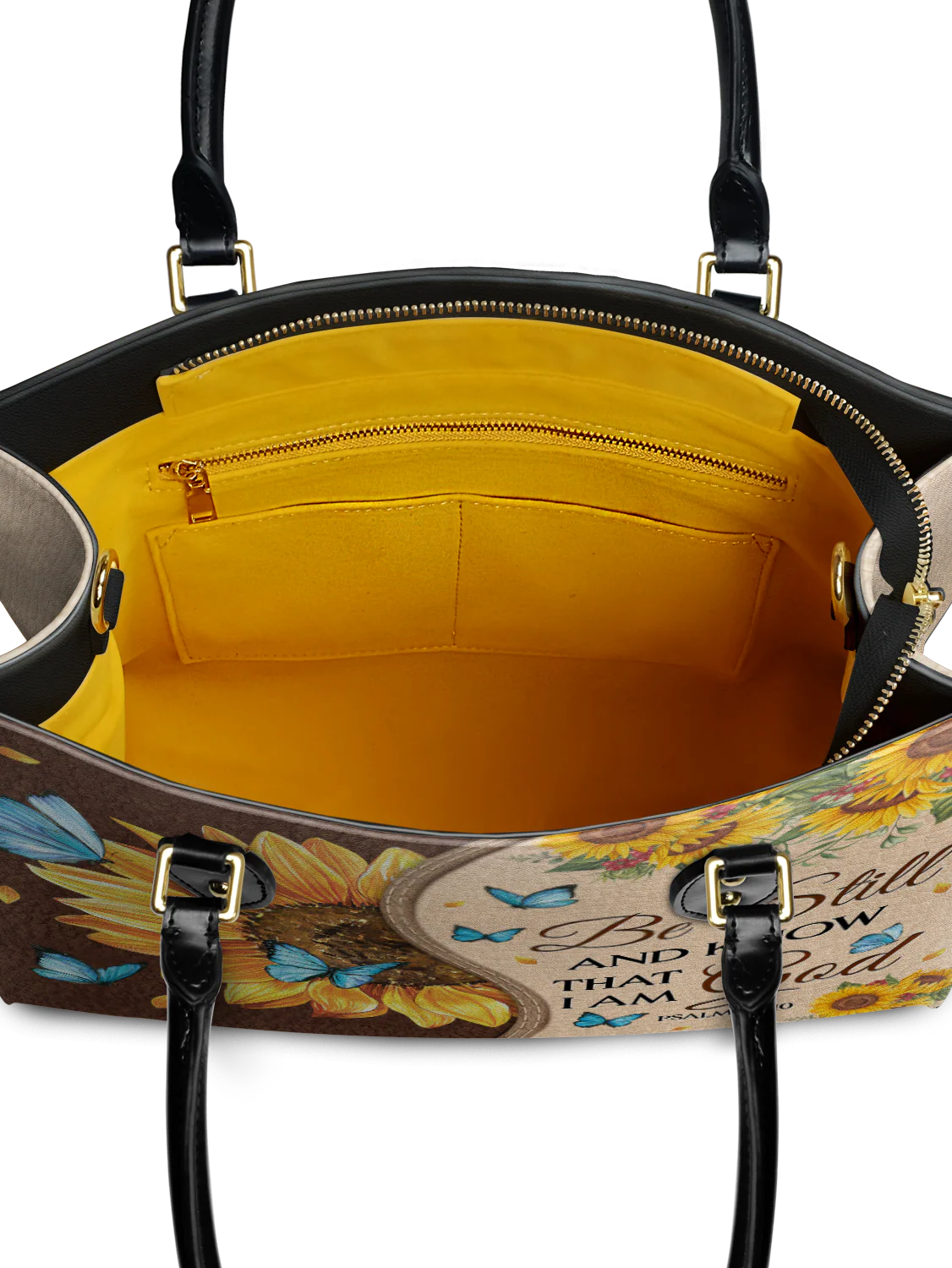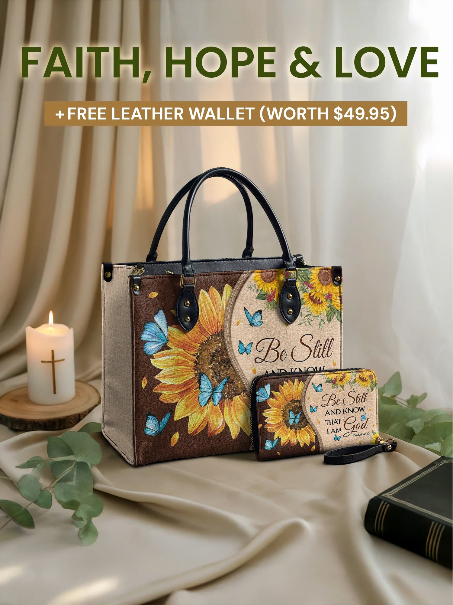 Featuring Psalm 46:10, it serves as a gentle reminder to be still and rest in His presence. The sunflower symbolizes faith and hope, while delicate butterflies reflect transformation and grace.