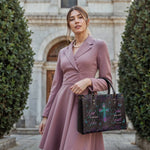 This handbag is spacious yet stylish, fitting up to 3 Bibles, a 14" laptop, books, wallet, and more.