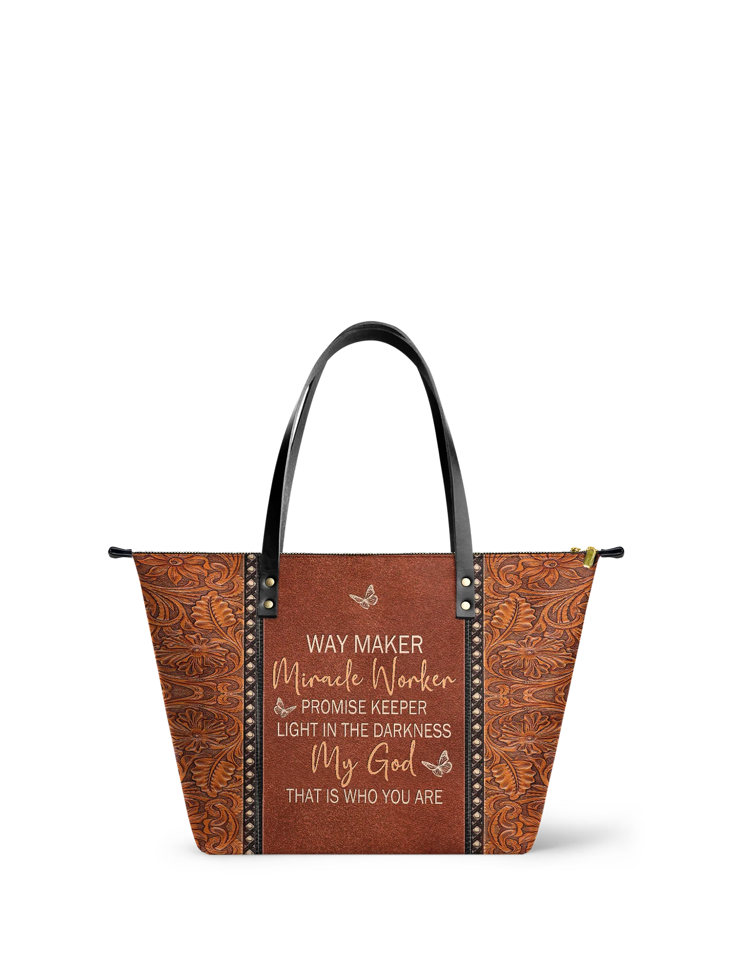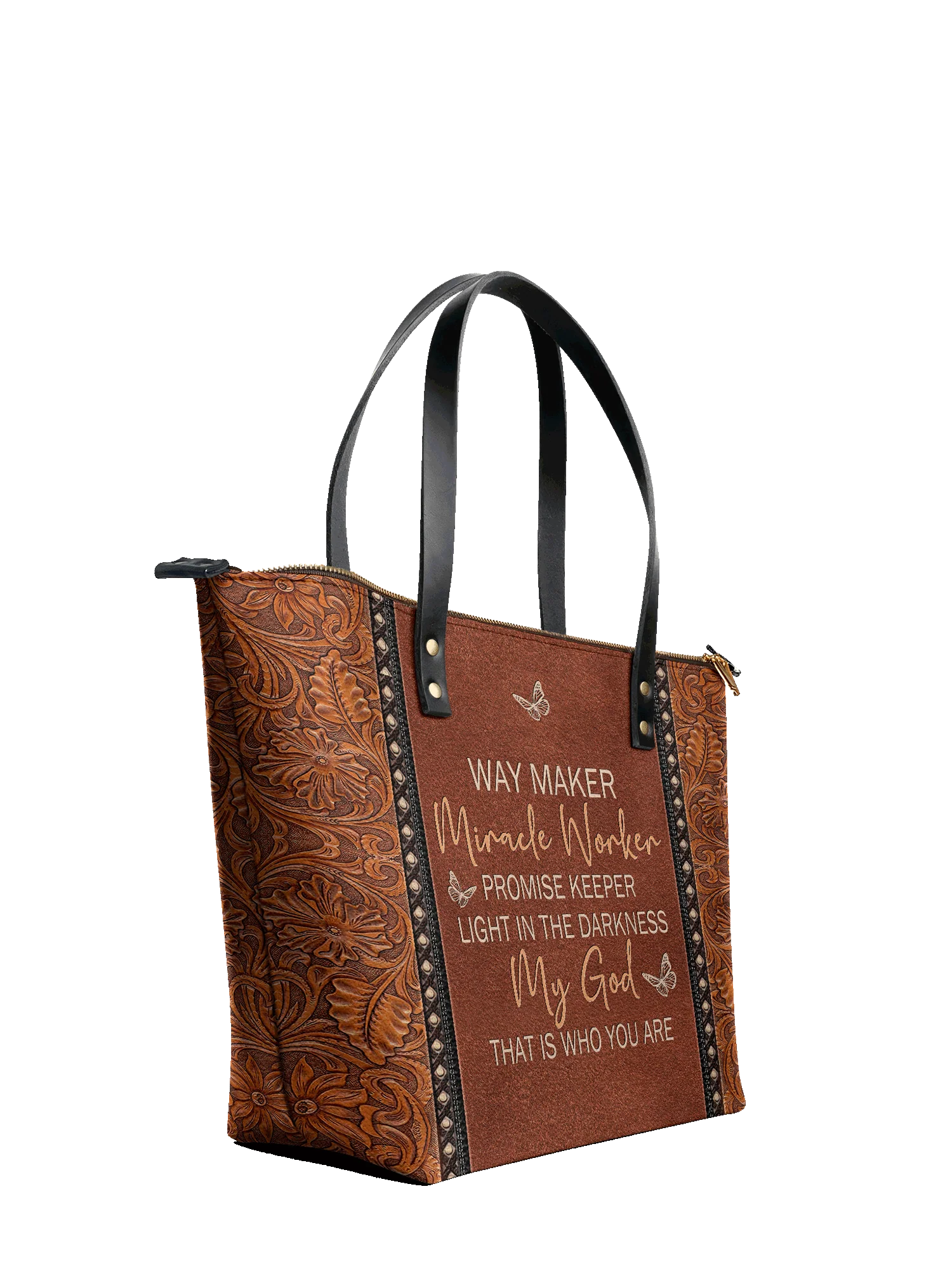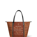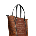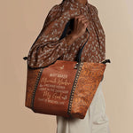 This tote bag is spacious and practical, easily fitting 2 large print Bibles, a 13" laptop, books, and daily must-haves.